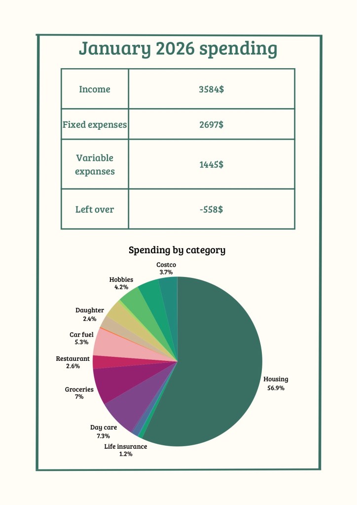 * Every expense related to housing is typically paid from my partner’s and my joint account. This includes mortgage payments, electricity, and Wifi bills. It also covers taxes, minimum debt payments, house and car insurance, and some shared expenses for my daughter. This amount represents my portion of the payments, with each of us paying half of every bill.